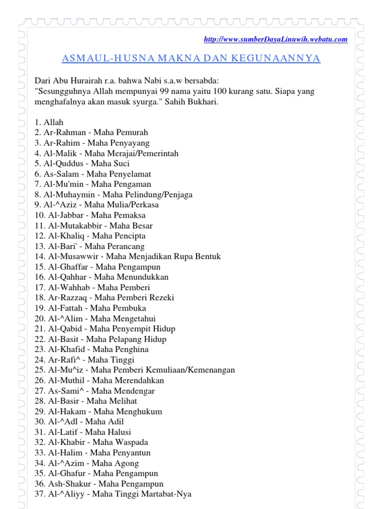 Mari kita belajar memahami tulisan latin asmaul mari kita belajar memahami tulisan latin asmaul husna beserta terjemahan indonesia. Maksud asmaul husna ialah seperti berikut: Informasi tentang makna asmaul husna dan 4 contoh penjelasan asmaul husna yaitu al alim al khabir as sami' al basir mengacu kepada pelajaran pendidikan agama islam kelas 7 sekolah lanjutan. Teks nadhom asmaul husna latin arab dan terjemah indonesia yang berjumlah 99 nama asma. Asma'ul husna merupakan salah satu cara untuk kita belajar mengenal allah.