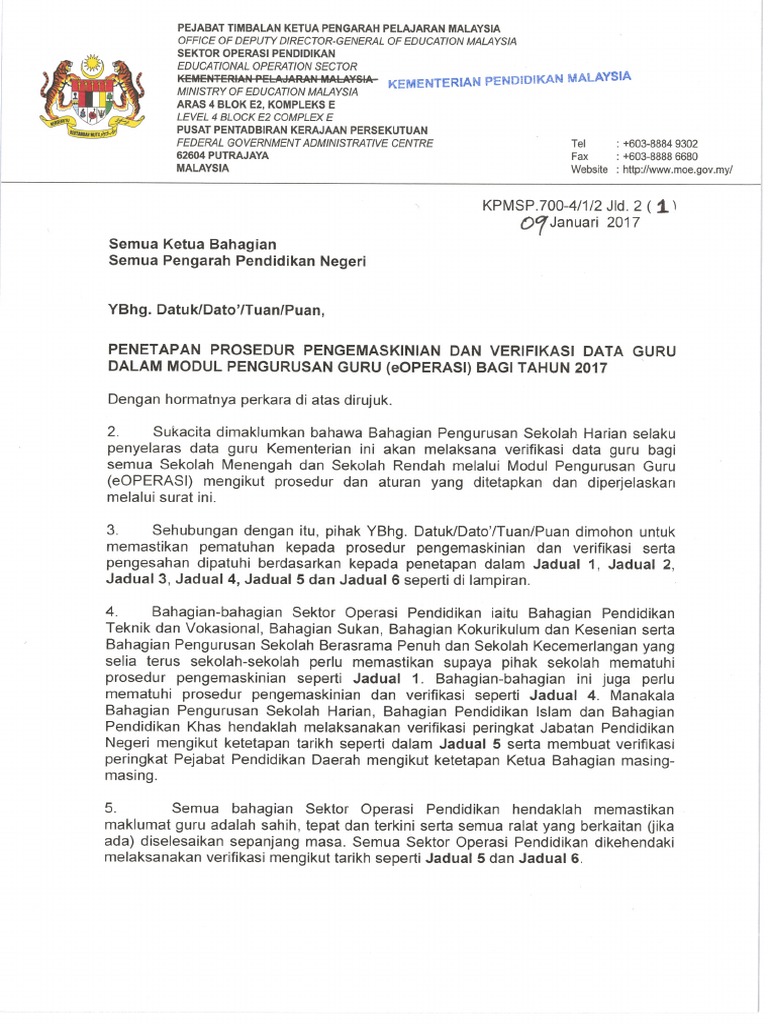 Surat Verifikasi Data Guru Eoperasi 09012017 Pdf from imgv2-1-f.scribdassets.com Dan yang menyebabkan sistem online e operasi kpm ini cukup penting adalah, setiap data guru perlu melalui proses verifikasi menggunakan sistem modul. Makluman kepada guru dan kakitangan sekolah di bawah kelolaan kementerian pendidikan malaysia (kpm). Seluruh guru di kpm ini diselaraskan maklumat guru di bawah eoperasi. E operasi merupakan salah satu modul bagi sistem pengurusan sekolah sps kementerian pendidikan malaysia kpm di bawah pengurusan guru. Modul ini melibatkan pengurusan data berkaitan guru dan bukan guru yang melibatkan beberapa kategori pengguna iaitu pentadbir sistem. Modul ini melibatkan pengurusan data berkaitan guru dan bukan guru yang melibatkan beberapa kategori pengguna iaitu pentadbir sistem. Tugas guru untuk memeriksa data dan mengemaskini data eoperasi. Bagi mendapatkan paparan terbaik, sila gunakan pelayar internet explorer (ie) 7 ke atas, mozilla firefox 3.0.18 ke atas.