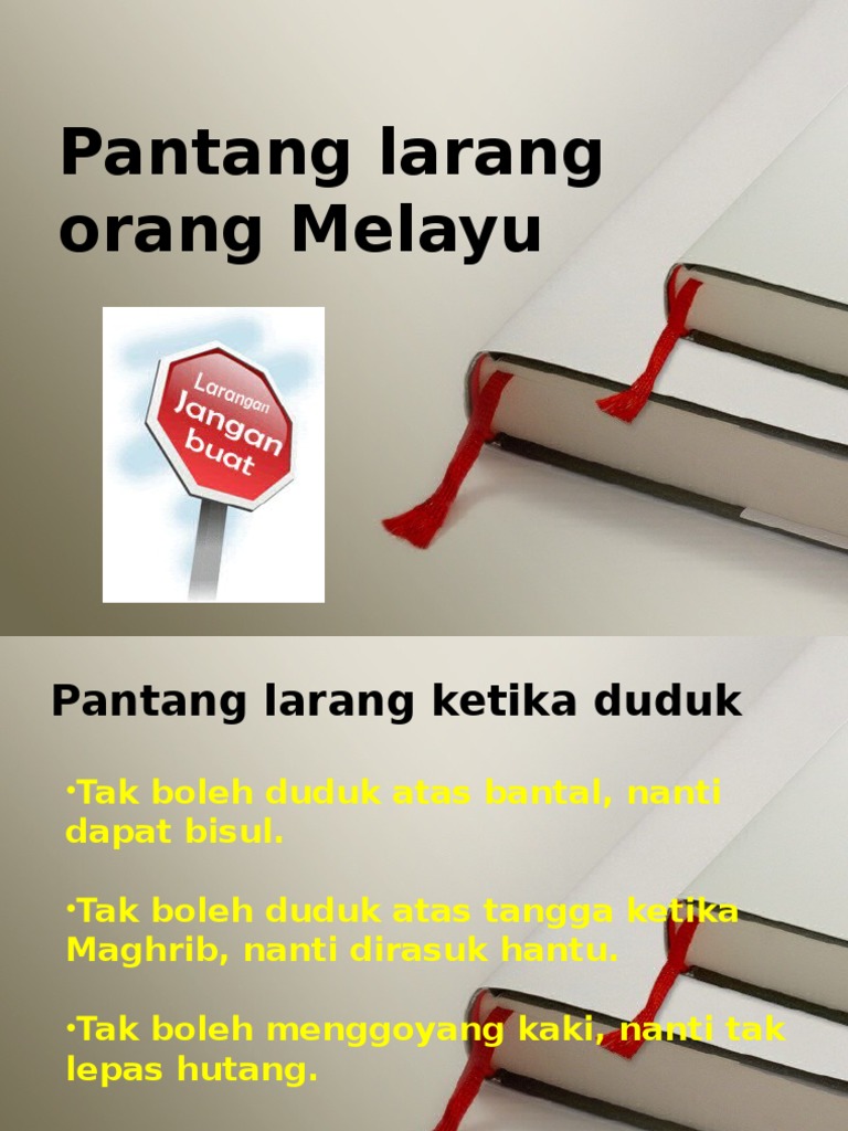 Related : Pantang Larang Orang Melayu / Ppt Pantang Larang Orang Iban Dayak Laut Powerpoint Presentation Free To View Id 589ca9 Mgq4n : We did not find results for:.